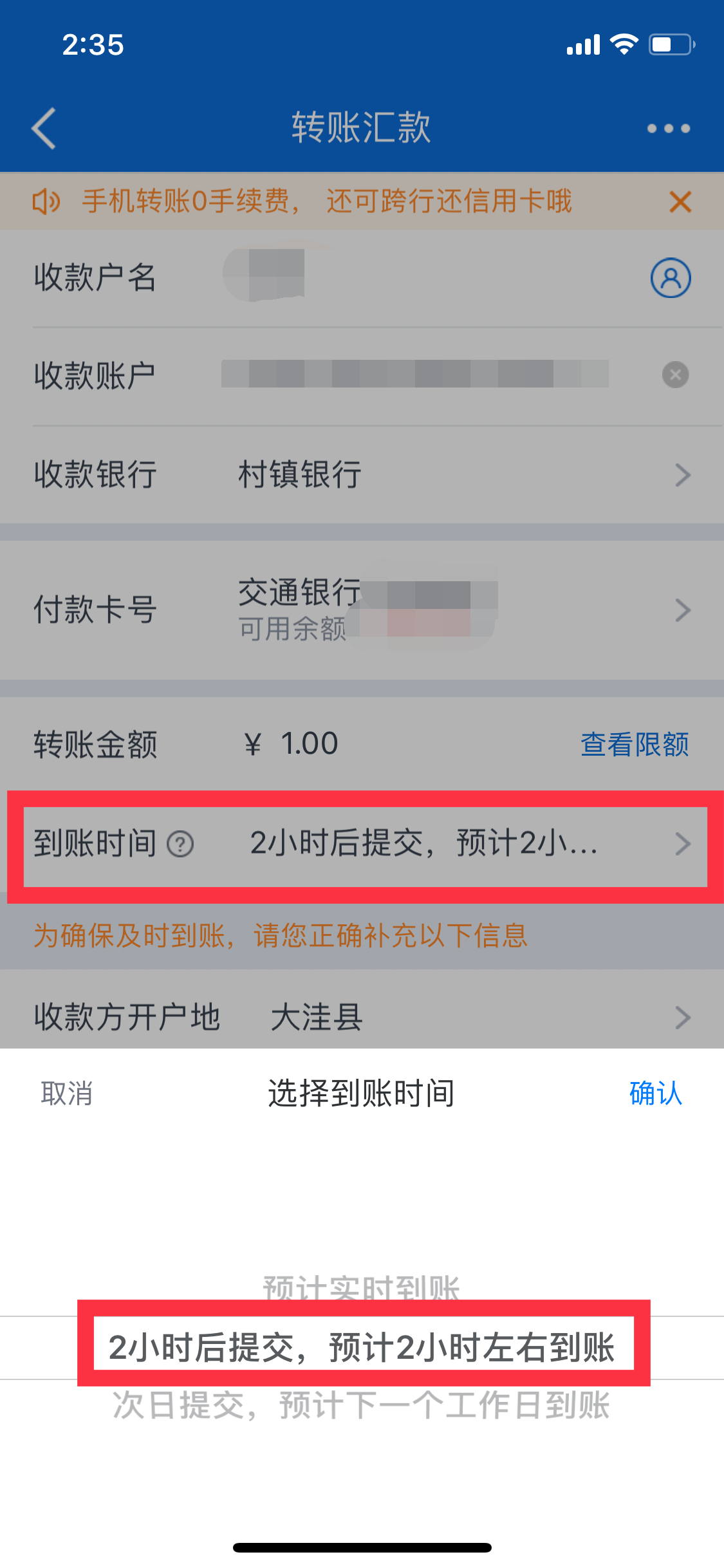 3、到账时间选择“2小时后提交,预计2小时左右到账”