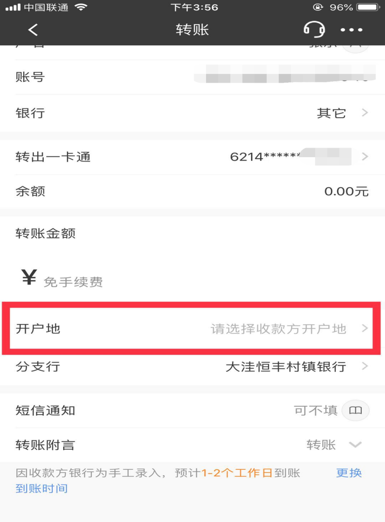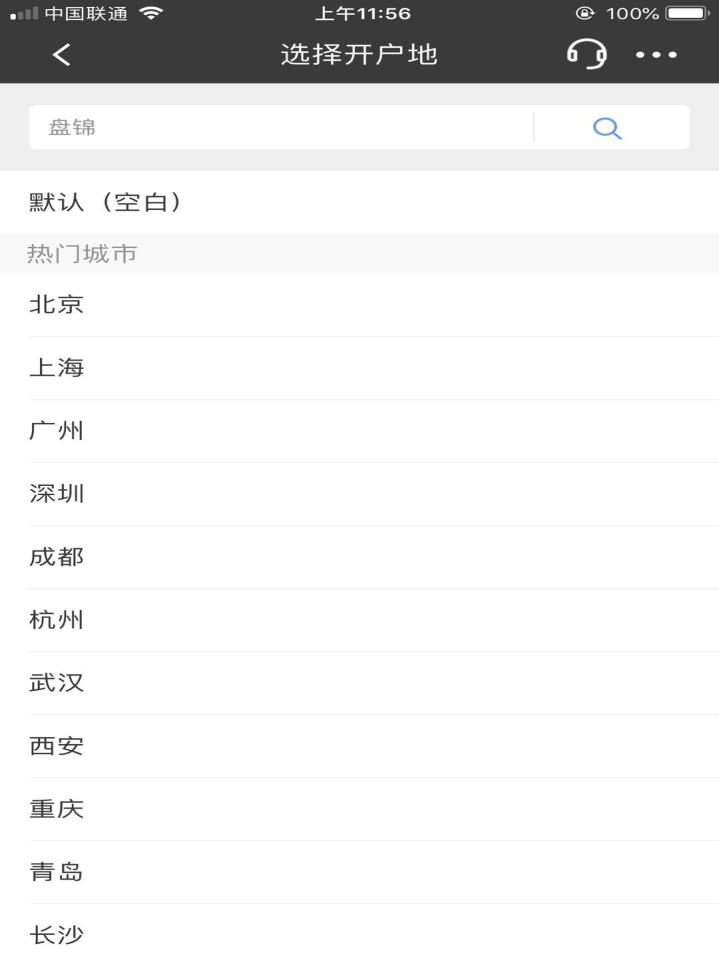7.开户地搜索“盘锦”,即可成功转账到我行