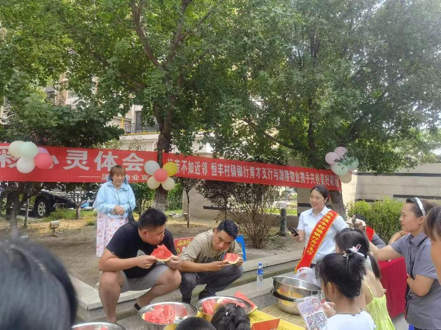 夏季的天空风都是懒洋洋的,连空气都变得闷热,在这样的天气中,育才支行和源隆物业共同举办的吃西瓜比赛就这样如火如荼的举行了,凉凉的西瓜和热情的工作人员深受大家的喜爱,选手们纷纷踊跃报名,找到合适自己的“对手”后便有秩序的进行着比拼。物业工作人员也积极地帮助客户们磨刀、清洗纱窗、测量血压,得到了大家的一致好评。